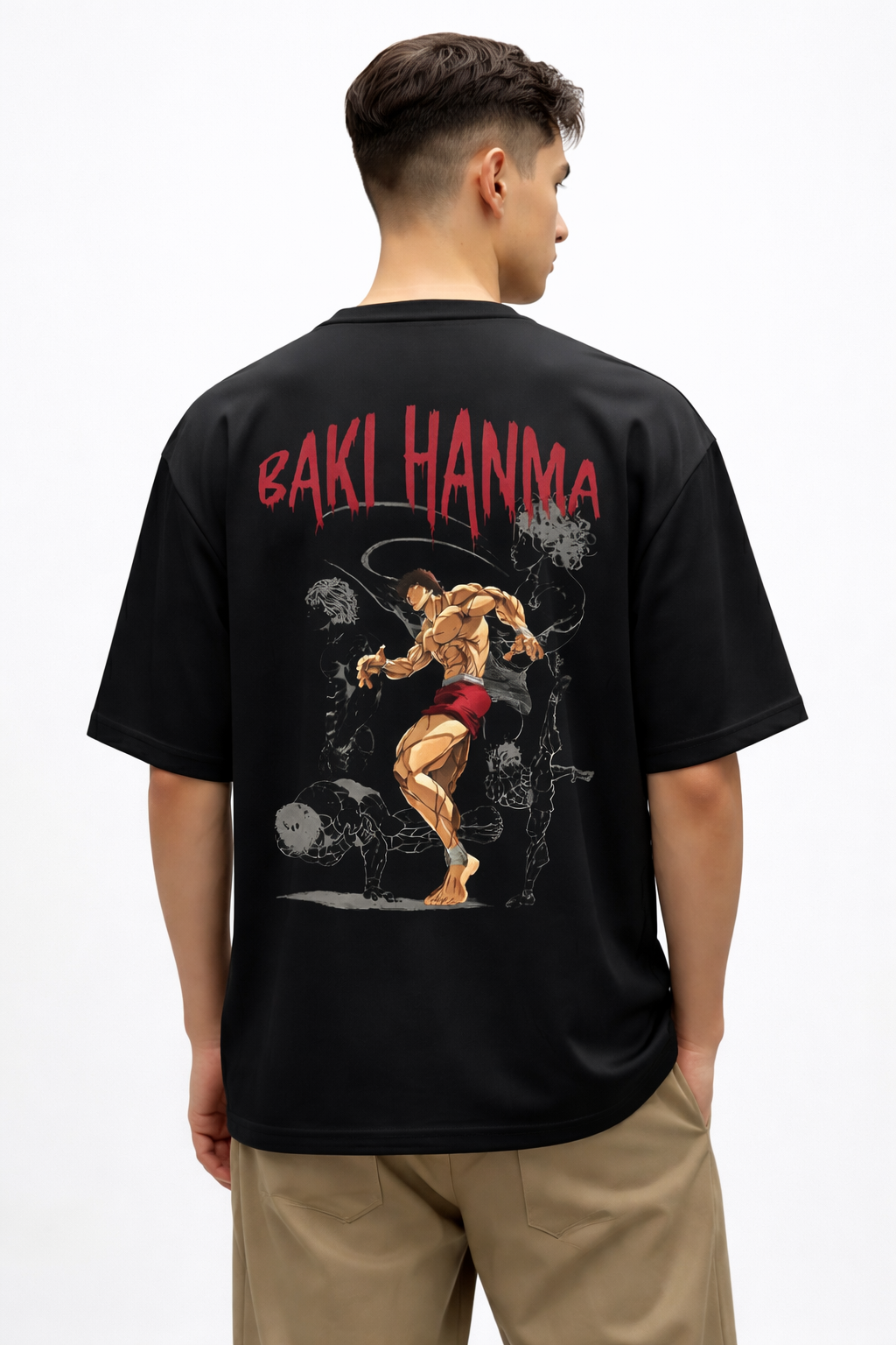 The Tierwear Baki Hanma Power Oversized T-Shirt showcases the raw strength and intensity of Baki Hanma with a dynamic anime action graphic on the back. Designed on a premium black oversized tee, this piece brings together high-energy anime visuals and modern street fashion. Made from soft, breathable cotton, it delivers superior comfort while making a bold style statement—perfect for gym-inspired looks, casual wear, and anime street culture.